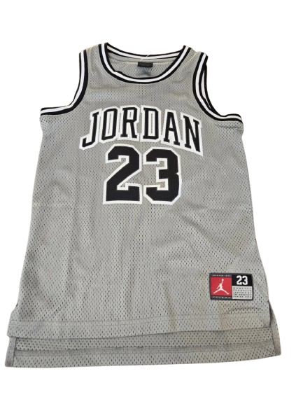 La camiseta Nike Jordan para jóvenes, en negro y gris, talla mediana (12-13 años), es una camiseta sin mangas elegante y cómoda, perfecta para los niños amantes del baloncesto. Fabricada por Nike, luce el icónico diseño del número 23, que representa tanto a la marca como al legendario jugador.